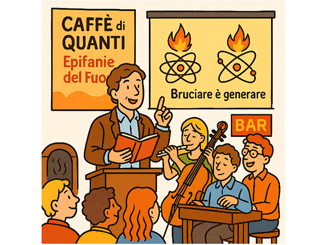 The format follows the tradition of Caffè dei Quanti: short introductory readings, a live music performance, and a popular-science talk designed to guide the audience through the “epiphanies” of fire.